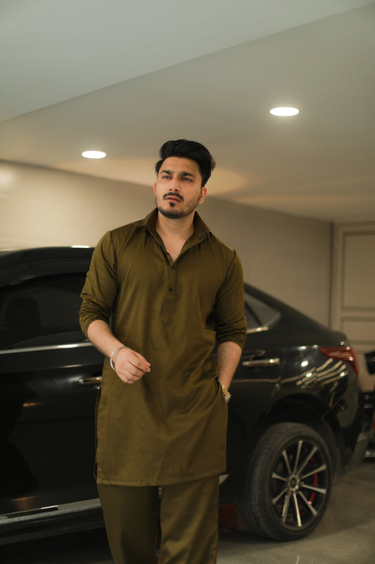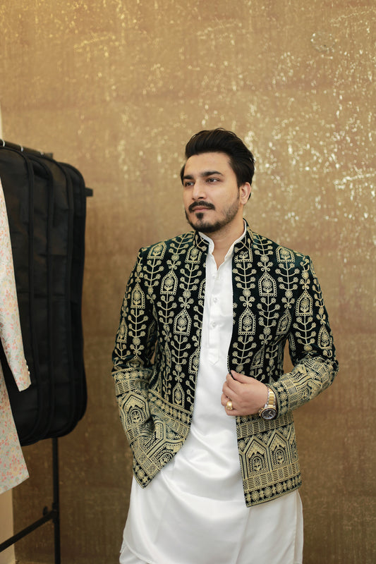 (Karam royal green velvet Jacket Kurta Pajama Set)