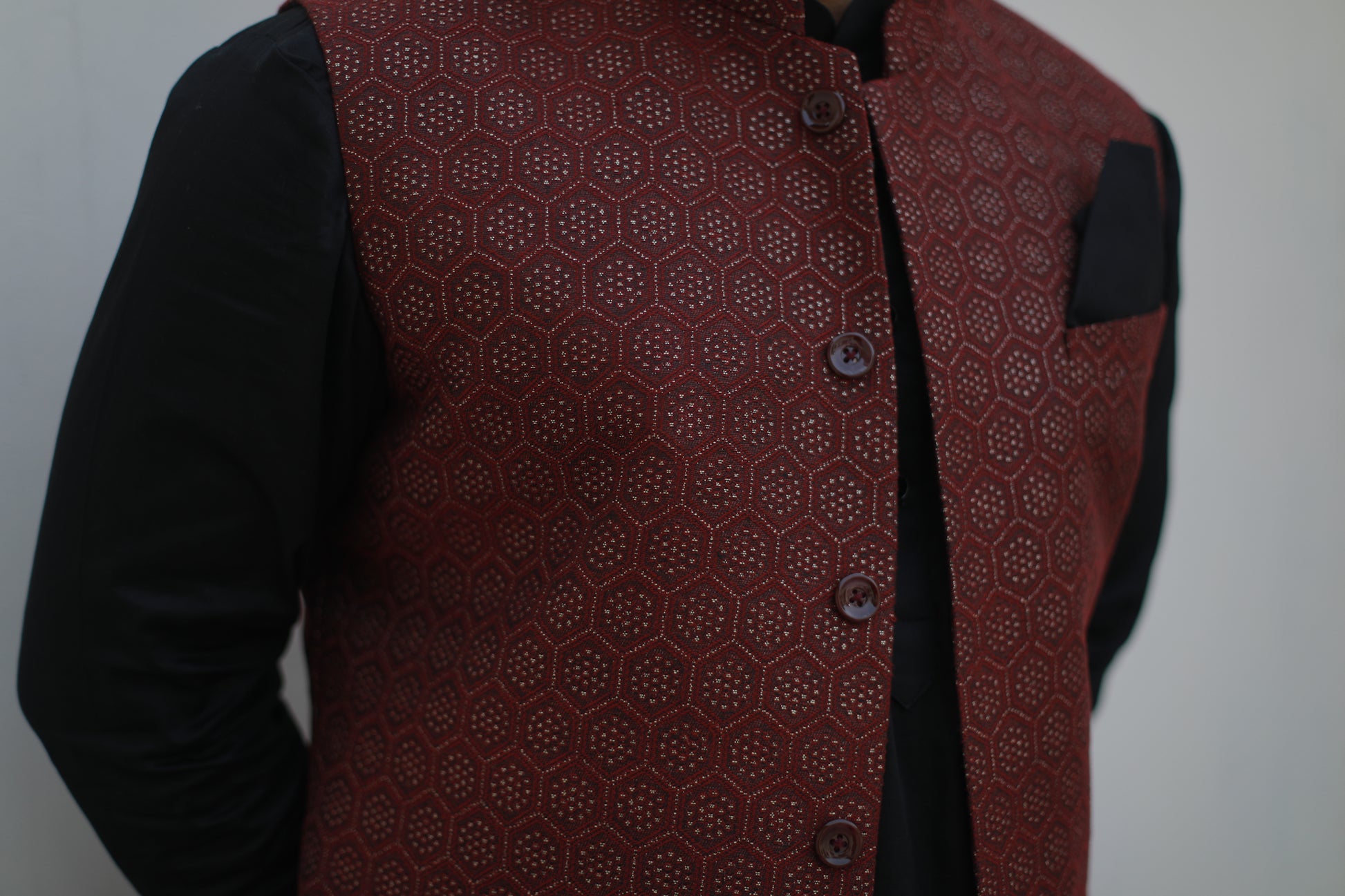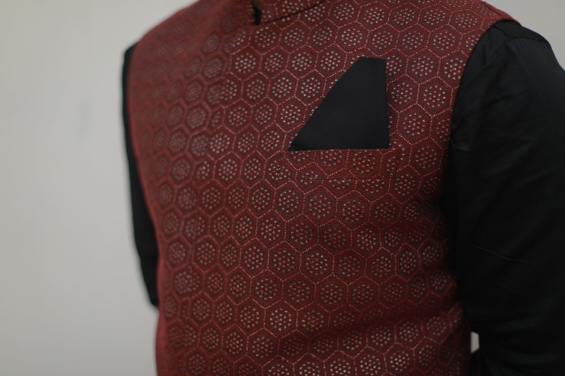 A black satin kurta with a maroon sleeveless jacket is a sophisticated and stylish choice for men’s ethnic wear. The satin fabric of the kurta adds a luxurious sheen, while the rich maroon color of the sleeveless jacket creates a striking contrast. To complete the look, pair it with matching black salwar or slim-fit trousers, and perhaps some metallic accessories or a simple watch to add elegance.