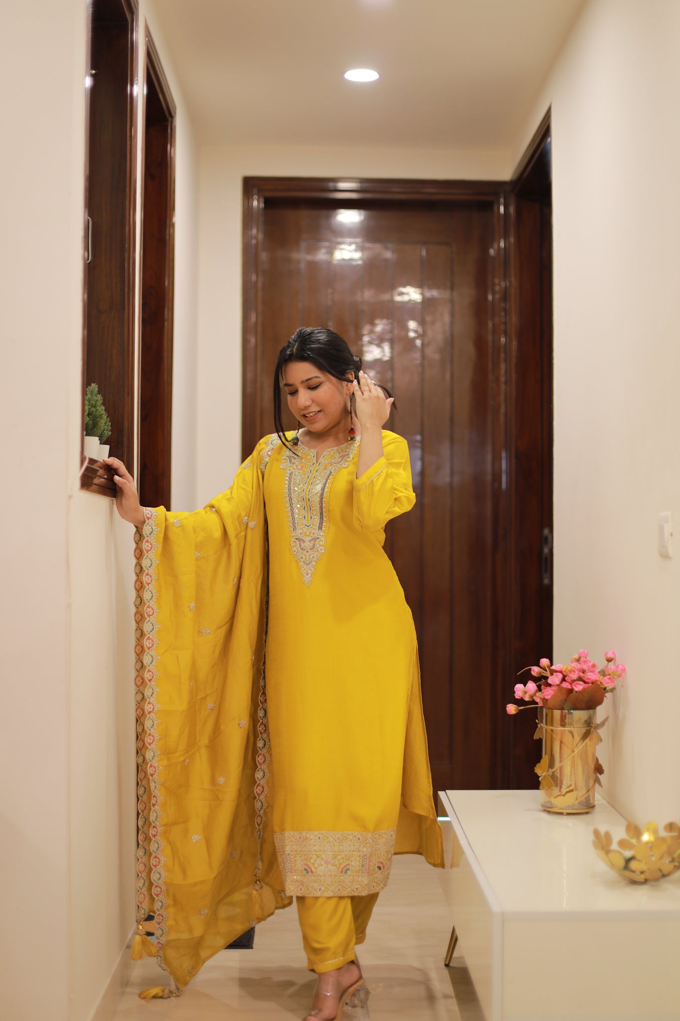 Step into the spotlight with our Mustard Suit Set, a luxurious choice for your partywear collection. This stunning ensemble features a beautifully crafted kurta in pure silk, showcasing intricate zardosi work that adds an element of opulence. The matching heavy silk dupatta drapes elegantly, enhancing the overall sophistication of the outfit. Perfect for festive occasions and celebrations, this suit set is designed to make a bold style statement.