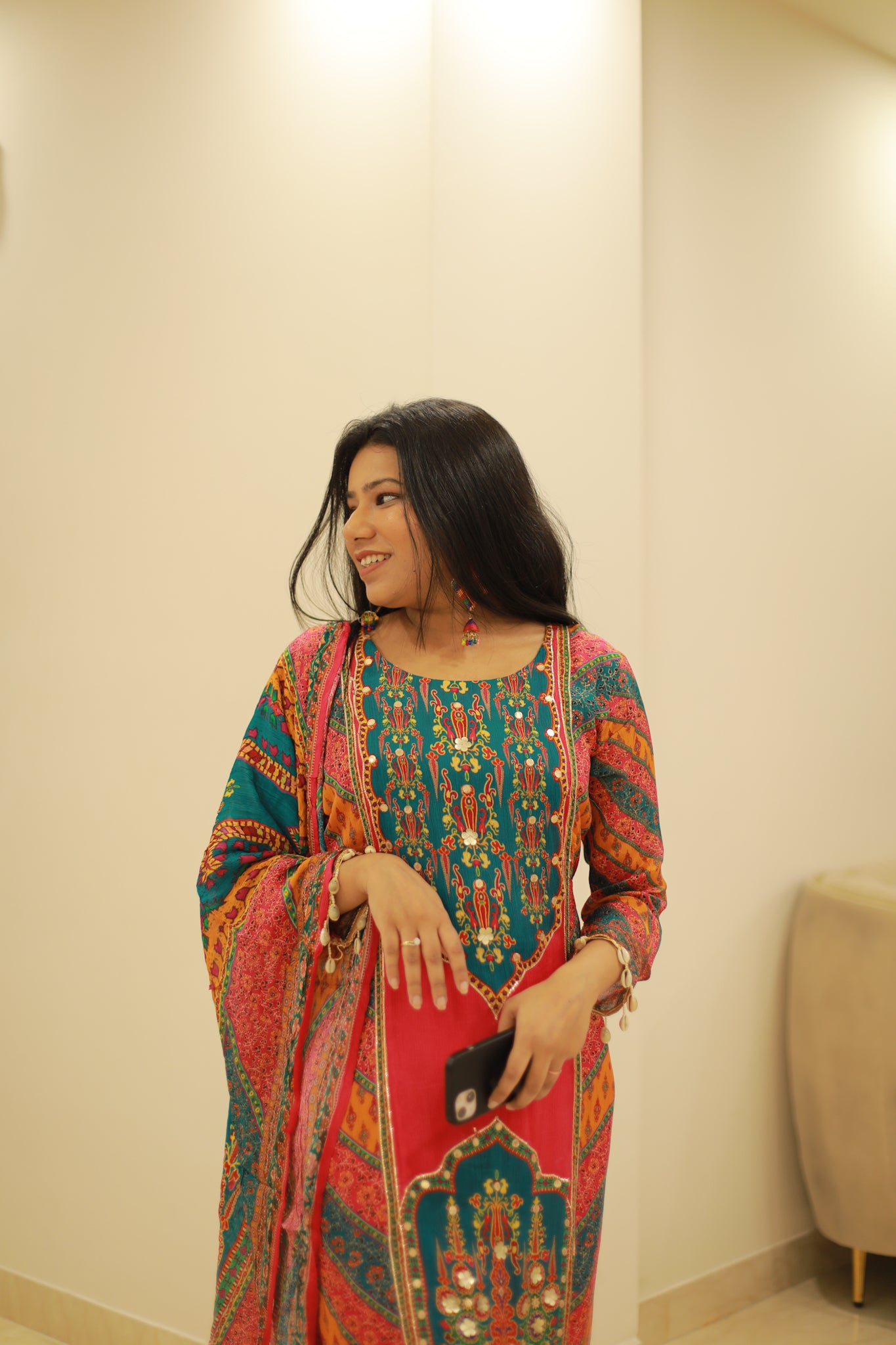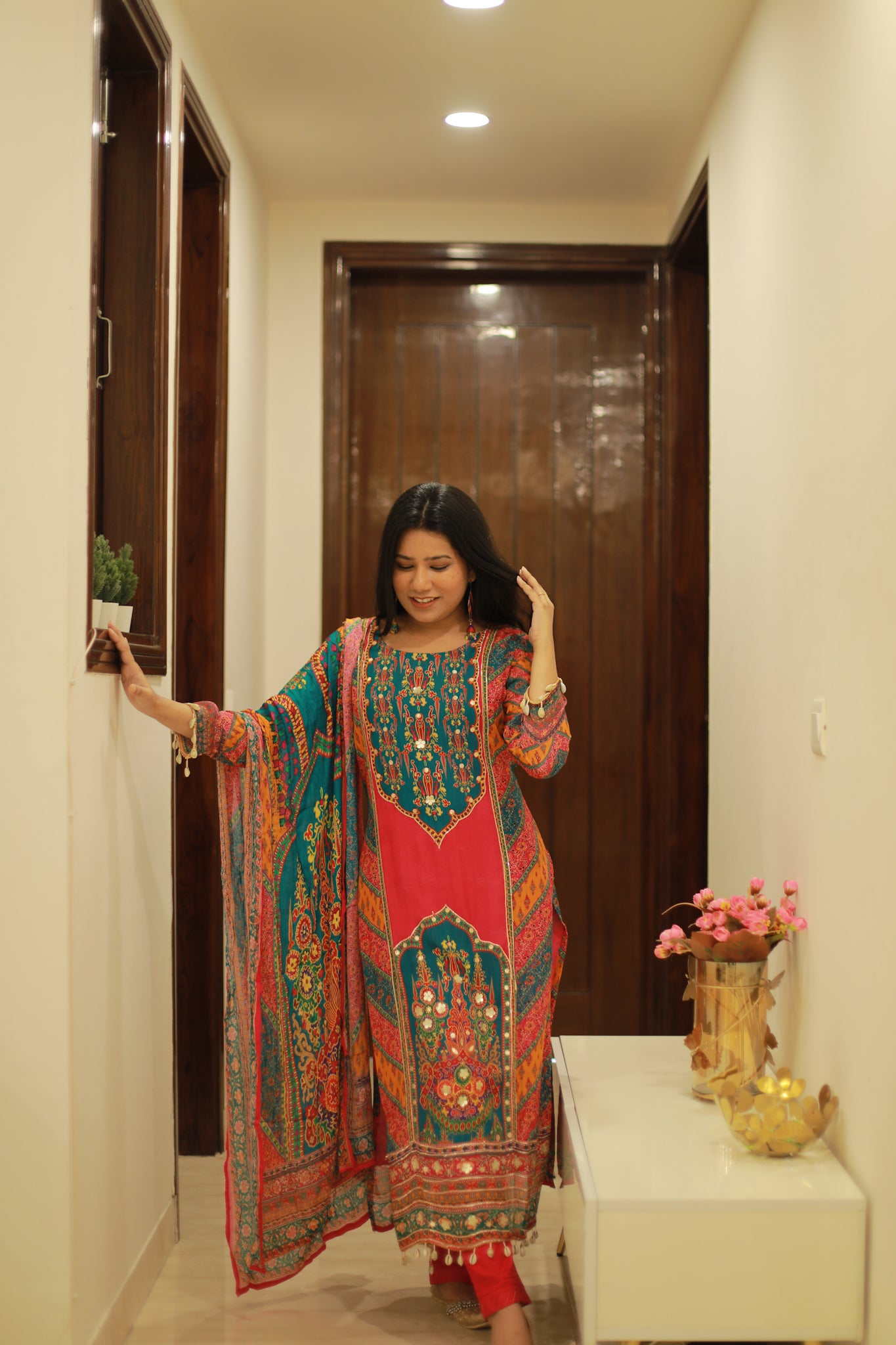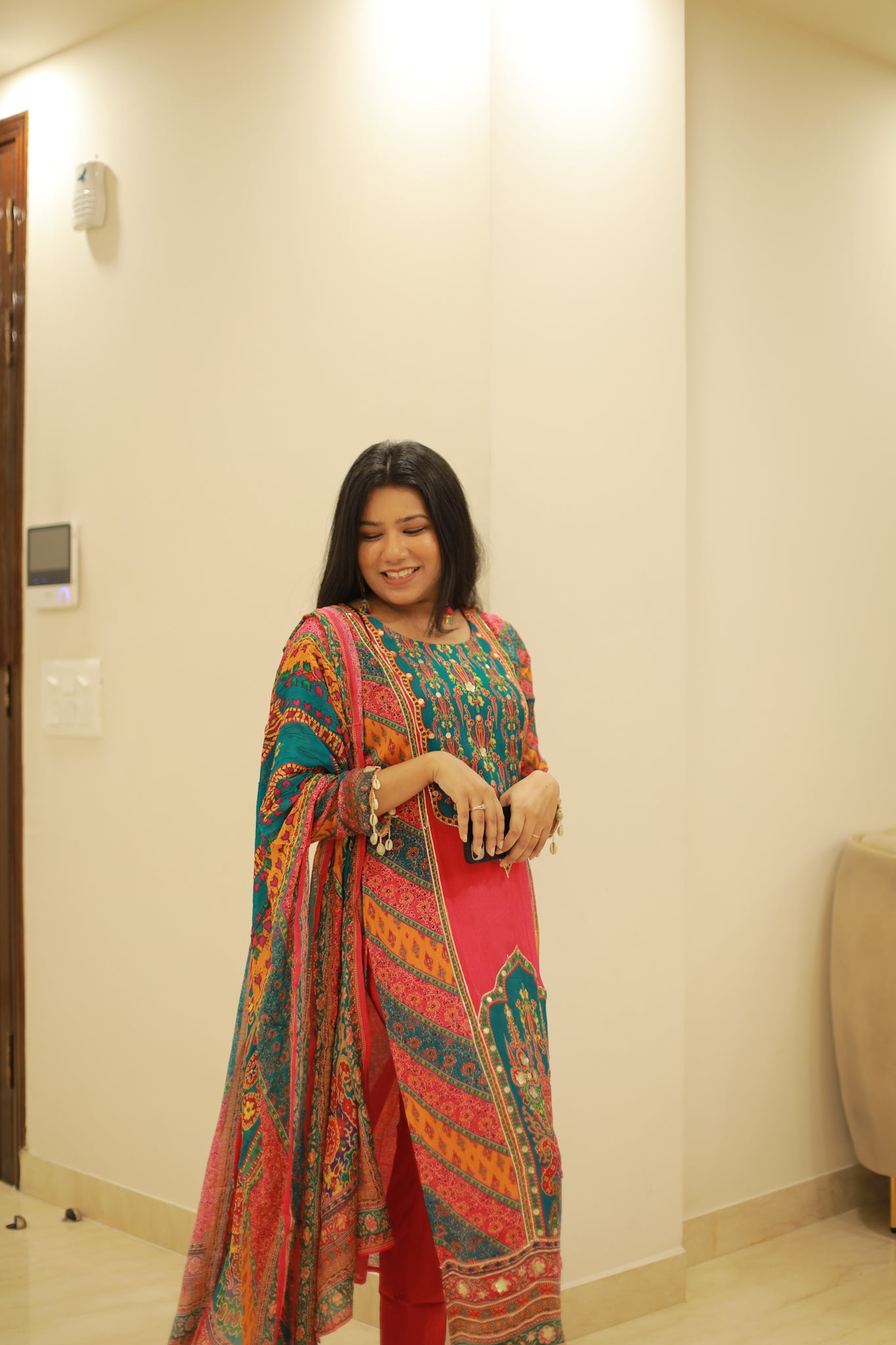 The set is beautifully complemented by a Pure Crepe dupatta featuring intricate kodi work, adding a touch of traditional artistry to the contemporary design.