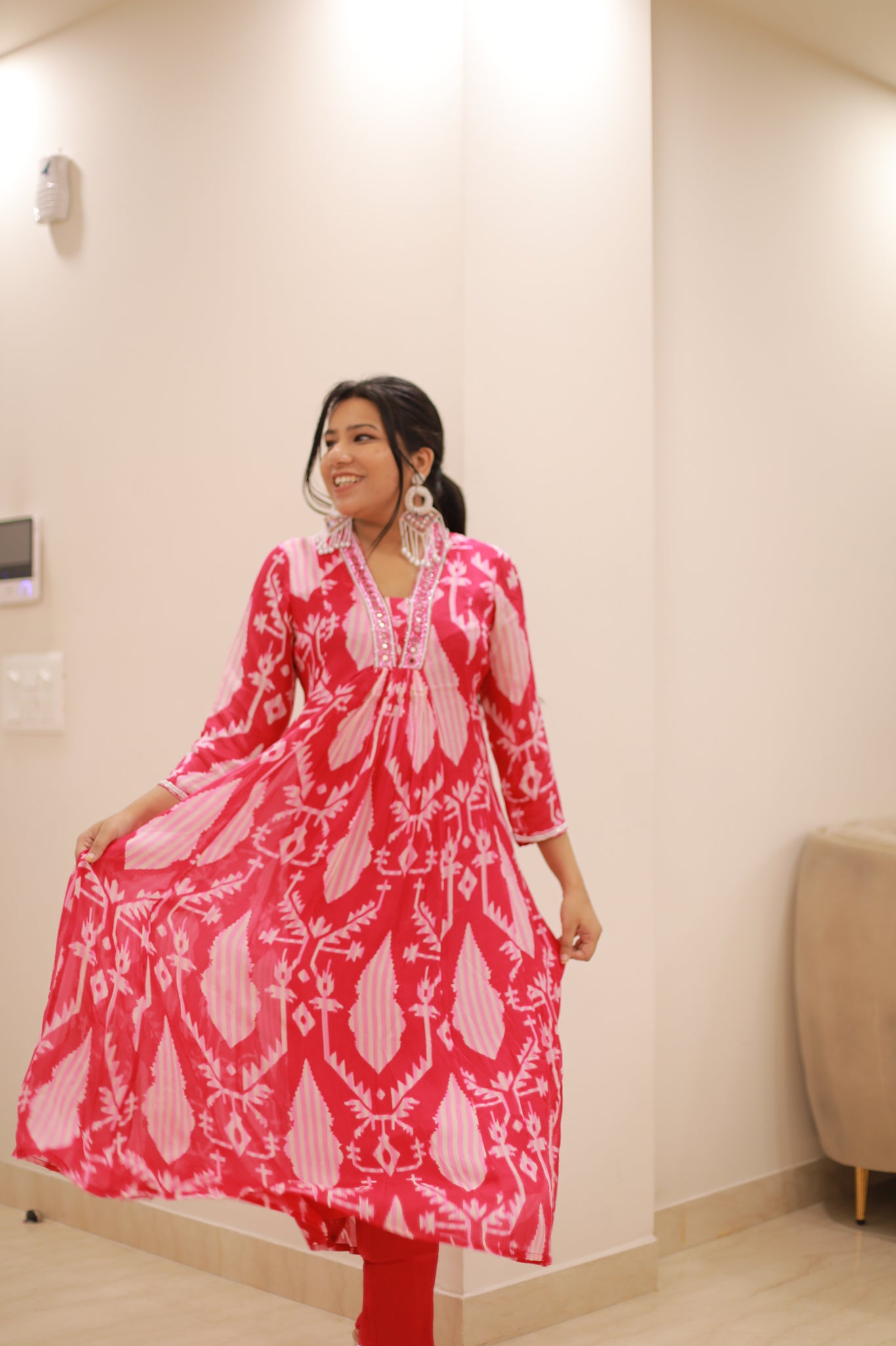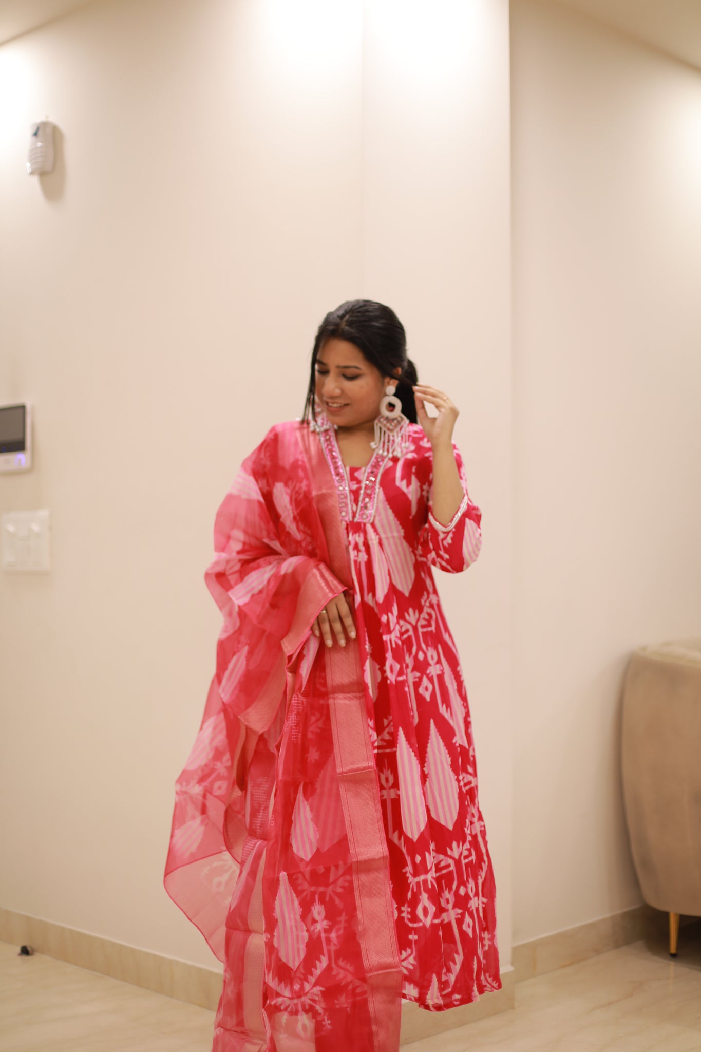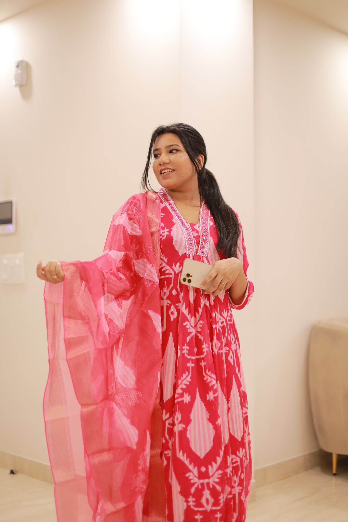 Add a vibrant touch to your festive wardrobe with our Magenta Suit Set. Crafted from luxurious chinon fabric, the kurti features exquisite pearl and mirror work that catches the light beautifully. The accompanying organza dupatta drapes elegantly, enhancing the ensemble's allure.